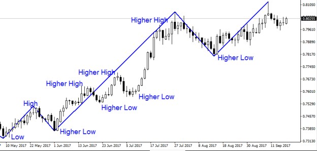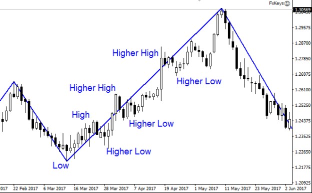 Aceasta înseamnă că într-un trend Up, prețul se va muta de la o valoare inferioară la una superioară și va coborî din nou la o valoare inferioară mai mare decât valoarea inferioară precedentă și va crește la o nouă valoare superioară mai mare decât valoarea superioară precedentă.