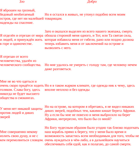 У меня было масса времени для того, чтобы предаться рассуждениям о моём положении, и чтобы не упустить ничего из моих мыслей, я стал их подробно записывать, не потому, что был высокого мнения о них и стремился увековечить, не для того, чтобы когда-нибудь помочь людям, попавшим в подобное положение (не думаю, что таких бедолаг в мире было слишком уж много), а просто для того, чтобы излить терзавшие меня чувства и тем облегчить себе душу. И постепенно, сколь ни горьки, сколь ни безнадёжны были мои рассуждения, мой разум стал подвигать меня от полного отчаянья к умеренному оптимизму. Я утешал себя стандартным доводом, каким утешают себя все падшие, говоря, что моё положение могло быть много хуже! Я представлял себя посланцем мирового добра, сражающегося с силами мировго зла. Беспристрастный и холодный, одновременно заимодавец и должник, я подробно фиксировал испытанные мной горести, а напротив – всё отрадное, что случилось за мной.