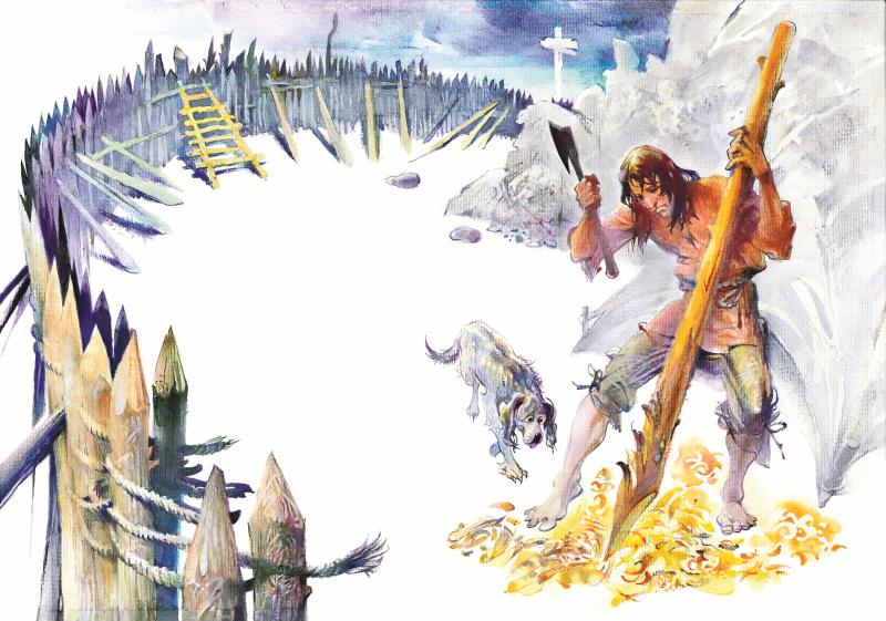 Первым делом Робинзон прочертил по краю площадки большой полукруг, намечая границы будущей ограды. Затем он принялся вырубать и затачивать колья, заколачивая их глубоко в землю по всему полукругу в два ряда. В узкое пространство между рядами заостренных кольев он насыпал и плотно утрамбовывал обрубки корабельного каната. Получился отличный крепкий частокол.