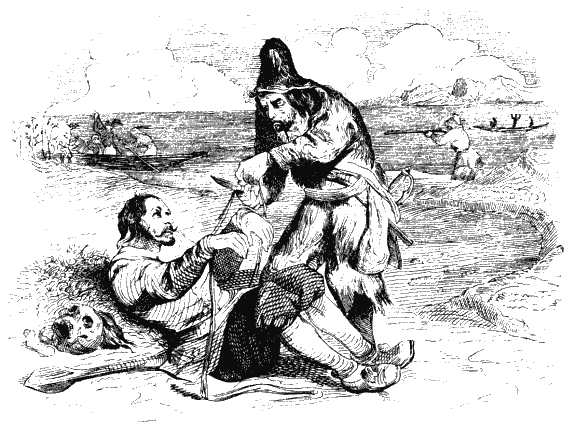Трое дикарей, спасшихся в лодке, работали веслами изо всех сил, стараясь поскорее уйти из-под выстрелов. Пятница раза два или три пальнул им вдогонку, но, кажется, не попал. Он стал меня убеждать взять одну из их лодок и пуститься за ними в погоню. Меня и самого тревожил их побег: я боялся, что когда они расскажут своим землякам о том, что случилось на острове, те нагрянут к нам, быть может, на двухстах или трехстах лодках и одолеют нас количеством. Поэтому я согласился преследовать беглецов на море и, подбежав к одной из лодок, прыгнул в нее, приказав Пятнице следовать за мной. Но каково же было мое изумление, когда, вскочив в лодку, я увидел лежавшего в ней человека, связанного по рукам и ногам, как испанец, и, очевидно, тоже обреченного на съедение. Он был полумертв от страха, так как не понимал, что творится кругом; краснокожие так крепко скрутили его и он так долго оставался связанным, что не мог выглянуть из-за бортов лодки и еле дышал.