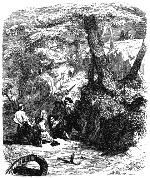 Вскоре я увидел, что лодка приблизилась к берегу, как бы выбирая место, где бы лучше пристать. К счастью, сидевшие в ней не заметили бухточки, где я когда-то приставал с плотами, а причалили в другом месте, приблизительно в полумиле расстояния от нее, говорю – к счастью, потому что, высадись они в этой бухточке, они очутились бы, так сказать, у порога моего жилья, выгнали бы меня и уже, наверно, обобрали бы до нитки.