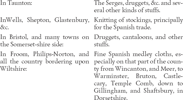 I mention this at large, because this trade of fine Spanish medley cloth, being the mix’d colours and cloths, with which all the gentlemen and persons of any fashion in England, are cloth’d, and vast quantities of which are exported to all parts of Europe, is so very considerable, so vast an advantage to England, maintains and supports so many poor families, and makes so many rich ones, that no man can be just in the description of things, and in a survey of this part of England, and not enter into a particular description of it; the above you may take as an introduction to it, only I shall add but a little more, concerning this county of Somerset, and shall, upon my entering into the north-west and west parts of Wiltshire, where the center of this prodigy of a trade is, sum it all up together, and shew you the extent of land which it spreads itself upon, and give you room, at least, to make some guess at the numbers of poor people, who are sustain’d and inrich’d by it.