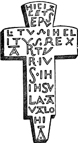As to the burial of King Arthur, Mr. Cambden makes no doubt of it, and gives us from Giraldus Cambrensis, an account how King Henry II. caused search to be made for his tomb, and before they had dug seven foot, they came to a great stone, having a cross of lead on the inside of it, and the subsequent letters, or inscription upon it, and in the following rude character; which the said Giraldus Cambrensis, Mr. Cambden says, was an eye-witness of, as well as of a coffin of hollow’d oak, which they found by digging nine foot deeper than the inscription, wherein were deposited the bones of that great prince.