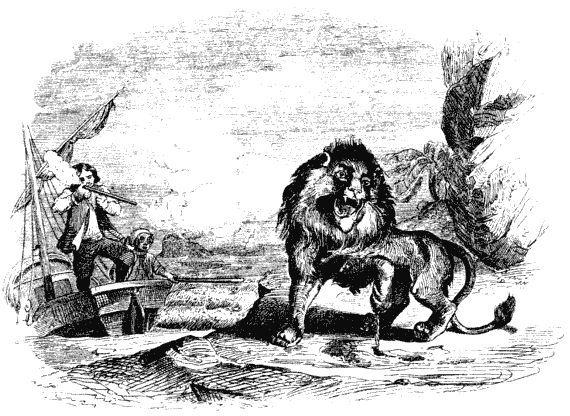 Я взглянул, куда он показывал, и действительно увидел страшилище. Это был огромной величины лев, лежавший на скате берега в тени нависшей скалы.