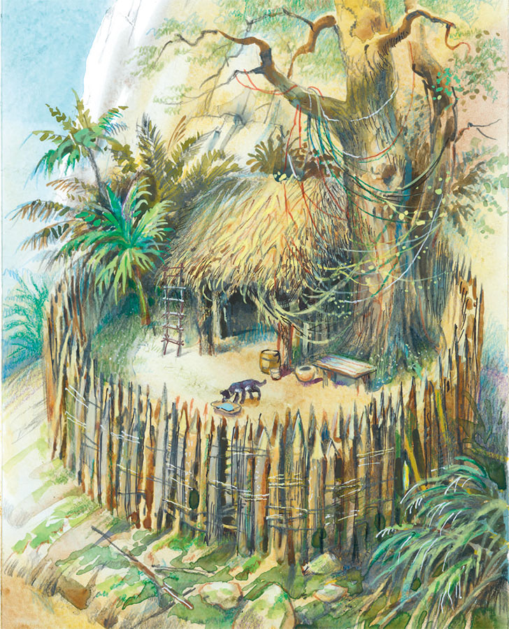 26 октября. Почти весь день бродил по берегу, отыскивая удобное место для жилья. Больше всего заботился о том, чтобы обезопасить себя от ночных нападений диких зверей и людей. К вечеру нашёл, наконец, подходящее место на крутом склоне холма и решил укрепить его оградой, состоящей из двух рядов кольев, обложенных снаружи дёрном; промежуток между рядами кольев я собирался заполнить корабельными канатами.