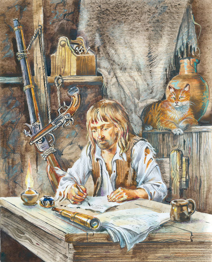Вот порядок моего дня: с утра, если нет дождя, часа два-три хожу по острову с ружьём, затем до одиннадцати работаю, а в одиннадцать завтракаю чем придётся, с двенадцати до двух ложусь спать (так как это самая жаркая пора дня), затем к вечеру опять принимаюсь за работу. Все рабочие часы в последние два дня трудился над изготовлением стола. Я был тогда ещё весьма неумелым столяром. Но время и нужда вскоре сделали из меня мастера на все руки.