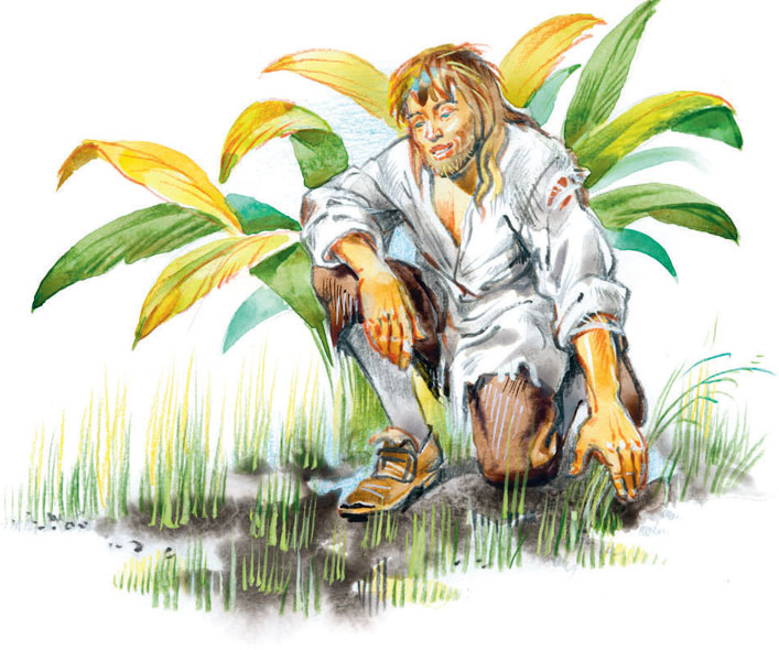 Невозможно передать, в какое смятение повергло меня это открытие! А вскоре я заметил, что рядом, на той же полянке, между стеблями ячменя показались редкие стебельки риса. Я подумал, что этот рис и ячмень растёт здесь ещё где-нибудь. Я обошёл всю эту часть острова, где уже бывал раньше, обшарил все уголки, заглядывал под каждую кочку, но нигде не нашёл ни риса, ни ячменя. Тогда наконец я вспомнил про мешок с птичьим кормом, который я вытряхнул на землю подле своего жилища.
