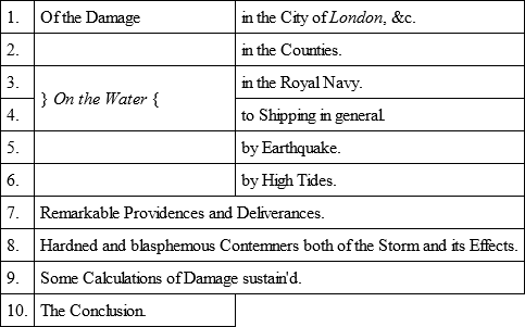 The particular dreadful Effects of this Tempest, are the Subject of the ensuing Part of this History: And tho' the Reader is not to expect that all the Particulars can be put into this Account, and perhaps many very remarkable Passages may never come to our Knowledge; yet as we have endeavour'd to furnish our selves with the most authentick Accounts we could from all Parts of the Nation, and a great many worthy Gentlemen have contributed their Assistance in various, and some very exact Relations and curious Remarks; so we pretend, not to be meanly furnish'd for this Work.