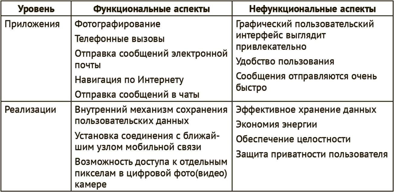 Одновременное изучение двух уровнейОпределение функциональных и нефункциональных аспектов и разделение на уровень приложения и уровень реализации можно выполнять одновременно, получая в результате двумерную таблицу. В табл. 1.1 показан результат мысленного разделения на уровни системы «мобильный телефон» с одновременным определением функциональных и нефункциональных аспектов.