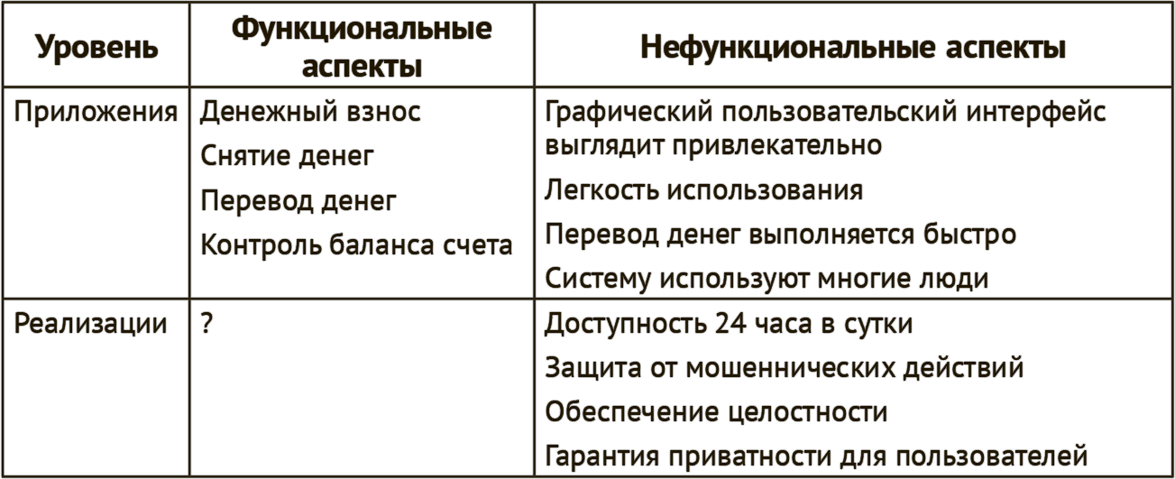 Применим концепцию разделения на уровни к платежной системе. В табл. 2.1 показаны некоторые потребности пользователей и некоторые нефункциональные аспекты на уровне приложения и на уровне реализации.