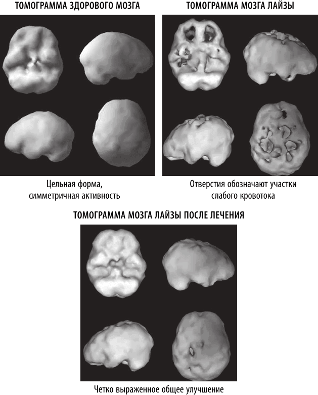 В начале нашей работы с Лайзой мы провели обследование на томографе методом ОЭКТ (однофотонная эмиссионная компьютерная томография), выявляющее состояние кровотока и мозговую активность – в общем, работу мозга. Ее томограмма демонстрировала резкое уменьшение кровоснабжения во всем мозге, что было тревожно, принимая во внимание семейную историю болезни Альцгеймера. Наше исследование позволило доказать, что болезнь Альцгеймера и другие виды деменции зарождаются в мозге за десятилетия до проявления видимых симптомов. У Лайзы уже были такие симптомы, и ее мозг показывал, что она движется к участи, постигшей ее мать и отца.