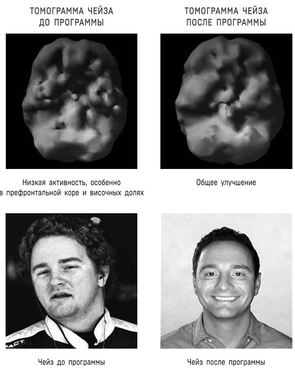 Просмотр снимков Чейза и история его жизни дали возможность понять, что у него вовсе не биполярное аффективное расстройство, СДВГ или ИЭР, а, скорее, долгосрочные последствия множественных сотрясений мозга и длительного воздействия токсичных паров бензина. Все это привело к появлению у него такой симптоматики. Мы отменили лекарства, которые он принимал прежде, назначили ему пищевые добавки, поддерживающие работу мозга, и приступили к реабилитации его мозга. Она проходила с помощью программы «Четыре круга для ЯСНЫХ УМОВ» клиники Амена, которая будет подробно изложена в следующих главах книги. В рамках программы мы полностью изменили диету Чейза, поощряя его есть только те продукты, которые способствуют здоровью мозга, а не те, которые ему вредят. Кроме того, он начал ежедневно заниматься спортом. Чейз выполнял все наши рекомендации.