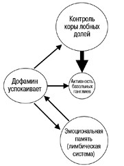 В норме «умная» кора лобных долей обеспечивает рассудительность и эмоциональный контроль. Лимбическая система тоже сильно влияет на эмоции и способность доводить дела до конца. Рис. 2.1 показывает эту цепочку самоконтроля. Дофамин направляет сильные желания. И при хорошей работе коры лобных долей они действуют как узда или тормоз, контролируя поведение. Недостаточная выработка дофамина связана с определенными проблемами: у человека снижается уровень мотивации, интерес, способность к концентрации на чем-то (так бывает при болезни Паркинсона и дефиците внимания). Зависимости возникают, когда цепочка замыкается и как бы берет контроль на себя.