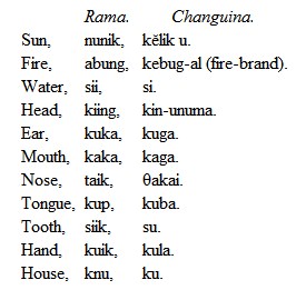 My informant writes me that the Ramas are about 250 in number, and are all Christians and able to speak and write English, except a few very old persons. Their language will probably be extinct in a few years. They are confined to their island in Blewfield Lagoon. It is particularly interesting, therefore, to fix their affinities before the opportunity passes. From the above vocabulary I think there is little doubt but that they are a branch of the Changuina or Dorasque stock, described pp. 174, 175. The following words attest this, the Changuina forms being from A. L. Pinart’s Vocabulario Castellano-Dorasque, Dialectos Chumulu, Gualaca y Changuina (Paris, 1890):