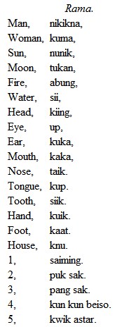 P. 163. Language of the Ramas. Since my negative observations about the Ramas were in type, I have received a short vocabulary of their language from the Rev. W. Siebärger, Moravian missionary on the Musquito coast. The orthography is German.