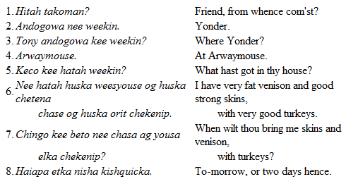 An ample specimen of this jargon is furnished us by Gabriel Thomas, in his "Historical and Geographical Account of the Province and Country of Pensilvania; and of West-New-Jersey in America," London, 1698, dedicated to Penn. Thomas tells us that he lived in the country fifteen years, and supplies, for the convenience of those who propose visiting the province, some forms of conversation, Indian and English. I subjoin a short specimen, with a brief commentary: —