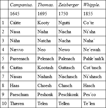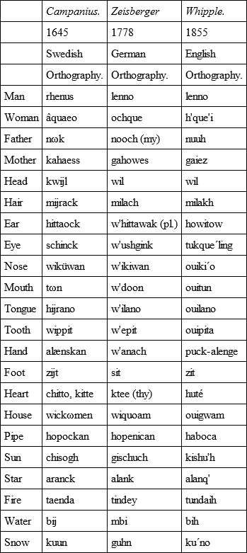 In connection with dialectic variation, the interesting question arises as to the rapidity of change in language. With regard to the Lenape we are enabled to compare this for a period covering more than two centuries. To test it, I have arranged the subjoined table of words culled from three writers at about equidistant points in this period. Each wrote in the orthography of his own tongue, and this I have not altered. The words from Campanius are from the southern dialect, which preferred the r to the l, and this substitution should be allowed for in a fair comparison.