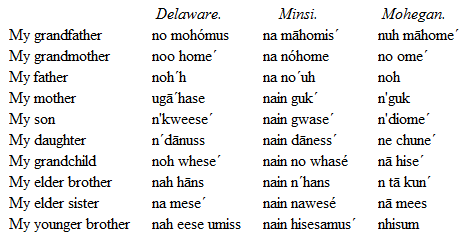 What differences there were have been retained and perhaps accentuated in modern times, if we may judge from the names of consanguinity obtained by Mr. Lewis H. Morgan on the Kansas Reservation in 1860. These are given in part in the annexed table, and the Mohegan is added for the sake of extending the comparison.