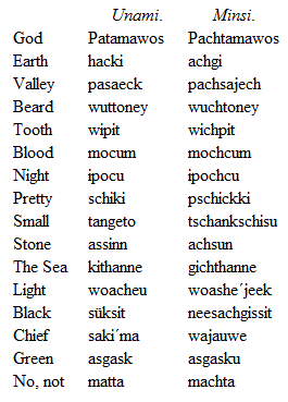 § 3. Dialects of the LenapeTwo slightly different dialects prevailed among the Delawares themselves, the one spoken by the Unami and Unalachtgo, the other by the Minsi. The former is stated by the Moravian missionaries to have had an uncommonly soft and pleasant sound to the ear[158], and William Penn made the same remark. It was also considered to be the purer and more elegant dialect, and was preferred by the missionaries as the vehicle for their translations.