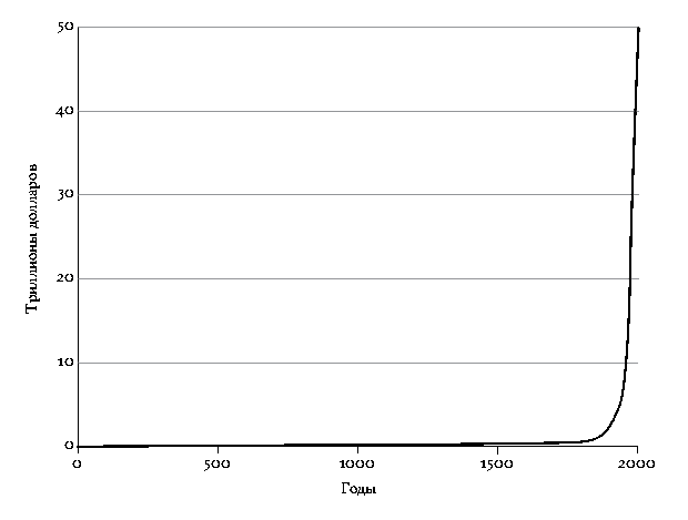 Экономический рост – совсем недавнее явление. На протяжении большей части 300 000 лет существования человечества экономическая жизнь почти не менялась. Наши далекие предки просто охотились и собирали то немногое, что им было нужно для выживания[45]. Но несколько сотен лет назад эпоха этой экономической бездеятельности внезапно закончилась. Объем производства в расчете на душу населения увеличился примерно в тринадцать раз, а мировой объем производства – почти в триста[46]. Если ужать человеческое существование до одного часа, то этот взрывной процесс произойдет в последние полсекунды или около того, т. е. буквально в мгновение ока (см. график 1.1[47]).