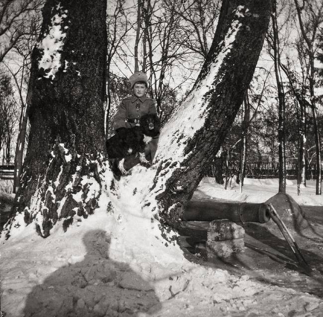 Тень Пьера Жильяра и царевич Алексей со своей собакой по кличке Джой в Царскосельском парке. Март 1917 г.