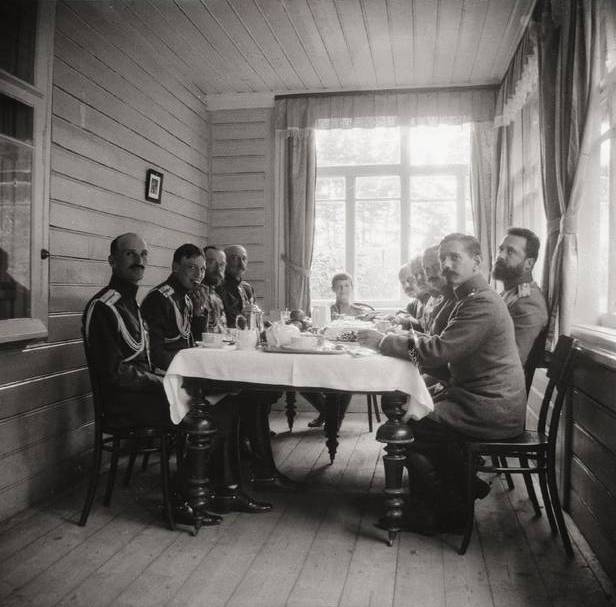 Пьер Жильяр (первый справа) с царевичем Алексеем в Ставке. Могилёв, осень 1915 г.