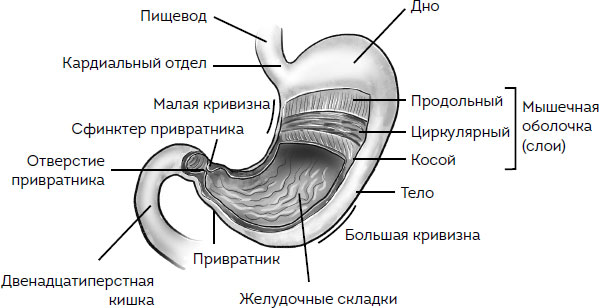 Объем пустого желудка составляет около 500 мл. После приема пищи объем увеличивается до 1 л, но способен увеличиваться и до 4 л. Слизистая оболочка желудка содержит железы, вырабатывающие соляную кислоту, а также пепсиноген, который с помощью соляной кислоты превращается в пепсин[3], защитную слизь желудка и гормоны.