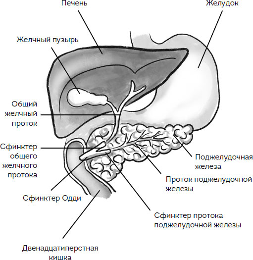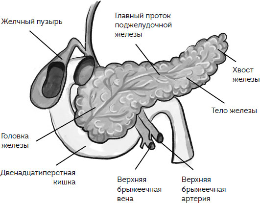 ПОДЖЕЛУДОЧНАЯ ЖЕЛЕЗА находится позади желудка, приблизительно на 5–10 см выше пупка, и длина ее составляет около 20 см.