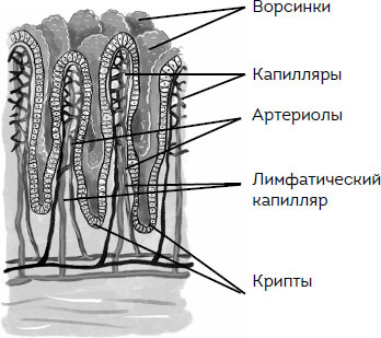 Поверхность тонкой кишки представлена множеством ворсинок, которые содержат сосуды и лимфатические капилляры. Через кровеносные сосуды происходит всасывание в кровь аминокислот и простых углеводов, а продукты расщепления жиров всасываются в лимфатические капилляры. Далее эти вещества с током крови распределяются по всему организму и идут на различные нужды: построение новых клеток, обеспечение органов и тканей энергией и пр. Также в тонкой кишке всасывается бо́льшая часть витаминов и минералов.