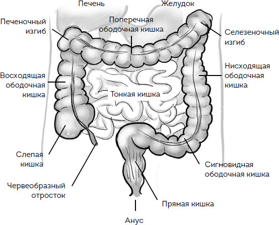 ТОЛСТАЯ КИШКА состоит из пяти частей. Она включает в себя слепую и восходящую ободочную кишку, поперечную ободочную кишку, нисходящую ободочную кишку и сигмовидную кишку.