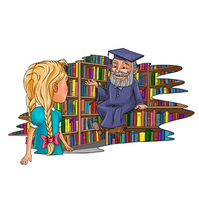 Вдруг кто-то подёргал Олю за рукав. Обернувшись, она увидела маленького человечка с неё ростом, который сидел на книжном стеллаже в самом углу и болтал ногами. Одет он был в профессорскую мантию и профессорскую шапочку с кисточкой на боку.