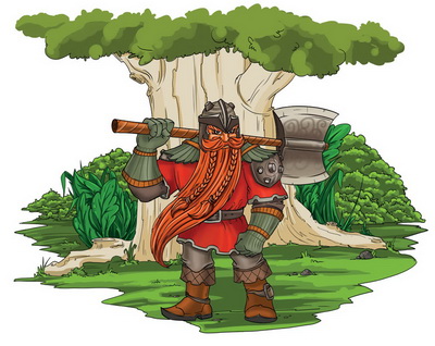 Упавшая девочка подняла глаза и увидела типичного гнома: низкорослого (хотя и гораздо выше её), широкоплечего, с клочковатой рыжей бородой, сердитыми чёрными глазами, одетого в надёжные доспехи и, конечно же, с верным топором в руках. Библиотека исчезла, зато прямо под ногами девочки была грунтовая дорога, ведущая по живописным местам.