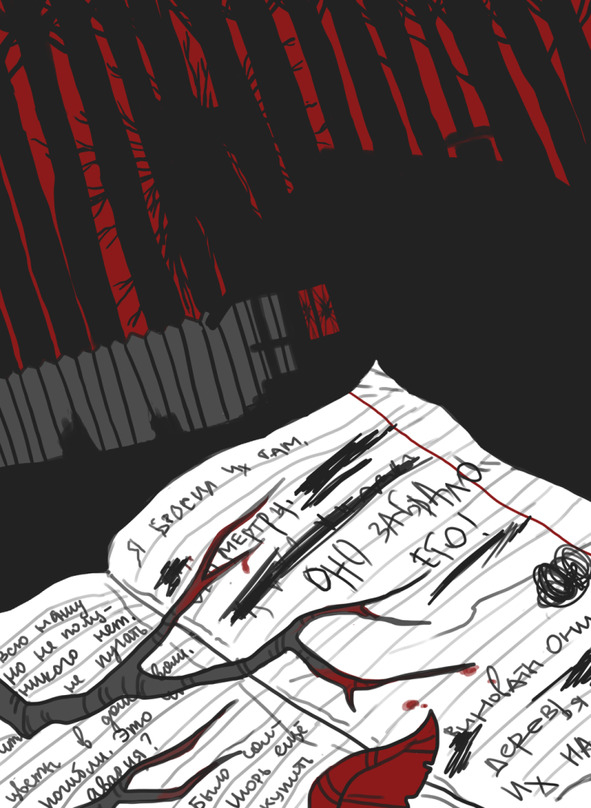16 августа. БОЖЕ МОЙ! Я БЫЛ ИДИОТОМ! КАКИМ ЖЕ Я БЫЛ ИДИОТОМ! СЛЕПЦОМ! ОНИ ВСЕ МЕРТВЫ! ИЗ-ЗА МЕНЯ! ГОСПОДИ, ЕСЛИ ЭТО КТО-НИБУДЬ ЧИТАЕТ… БЕГИТЕ ПОДАЛЬШЕ ОТ ЭТОГО ПРОКЛЯТОГО ЛЕСА! Ночью нас разбудил Игорь, вопил «Он забрал Настю! Он забрал Настю!». Мы кинулись наверх, к её комнате, и действительно, Настя пропала. Только окно было открыто настежь. Кто то забрался в наш дом через окно. Мы выбежали звать Настю на улицу, несмотря на все уговоры Игоря не выходить наружу. Скоро из леса донёсся крик «Мама!!!». Мы тут же кинулись на голос, что естественно. Только о жизни своей дочери я тогда думал. И даже ножа не взял с собой, никакого оружия… Еще какое-то время мы шли на крики, собирая по пути все паутины, вышли на поляну, где увидели Настю. Она одна и никого больше. Она плакала. Когда мы подошли к ней, она закричала: «Оно не отпустит нас домой! Оно не отпустит нас домой!».