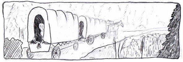 Началось распределение по фургонам, которые представляли собой крытые белым брезентом повозки с округлой крышей. В одном фургоне могло путешествовать до пяти человек, но если кому-то места всё же не хватало, ему предлагали ехать на лошади. Эдвин разделил фургон с тем самым тихо говорящим человеком с метающимся из стороны в сторону взглядом, каким-то светловолосым человеком и с доктором.
