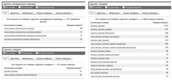 То есть если мы напишем запрос «сделать посадочную страницу», то увидим охват менее 100 человек. Если забьем «сделать лэндинг» (через «э») – и того меньше. Но стоит ввести «сделать лендинг» (через «е»), и охват становится уже в районе двух с половиной тысяч, плюс куда больше вариаций уточняющих запросов. И это только одна группа.
