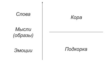 Суть механизма в том, что у мозга человека есть кора (в которой «живет» сознание и которая «думает») и подкорка, ее еще называют «мозг рептилии» (в ней, собственно, и зарождаются все эмоции и желания). Все процессы в подкорке происходят бессознательно, на базе рефлексов. Затем сигнал передается в кору, преобразовываясь в мысли, а мысли, в свою очередь, сознательно преобразуются корой в слова.
