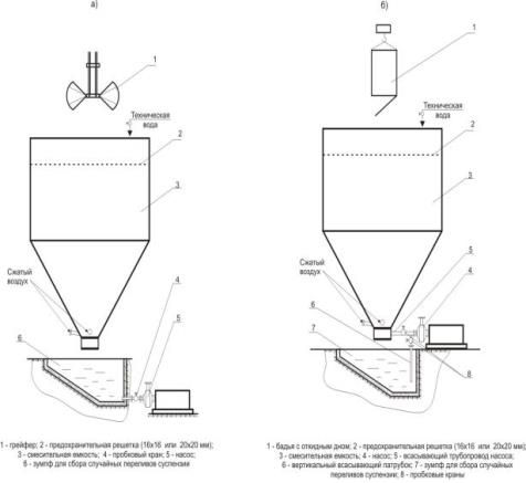 Для приготовления суспензии в помещении склада устанавливается емкость. Из траншей магнетит по мере необходимости выбирается грейфером, подвешенным на монорельсовой тележке, и подается на предохранительную решетку в емкость заполненную водой и барботируемую сжатым воздухом (рис. 1.12, а). Приготовленная суспензия, требуемой плотности, насосом перекачивается в сборник кондиционной суспензии тяжелосредной установки.