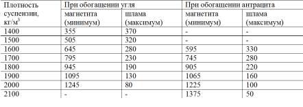 Плотность магнетитовой суспензии выбирают в зависимости от свойства обогащаемого угля и целей обогащения. Она должна быть промежуточной между плотностями разделяемых компонентов. В практике обогащения углей обычно используются суспензии плотностью от 1350 до 2050 кг/м3.