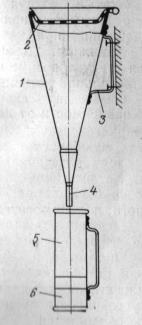 1 – воронка диаметром 165 мм, длиной 440 мм; 2 – стека; 3 – ручка-кронштейн; 4 – капилляр 5×100 мм; 5, 6 – кружка вместимостью 500 см3 и 200 см3