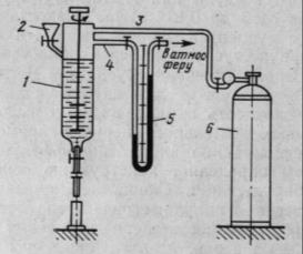 Рис. 1.14. Схема установки капиллярного вискозиметра: 1 – резервуар; 2 – воронка; 3, 4 – патрубки; 5 – манометр; 6 – баллон сжатого воздуха (азота)