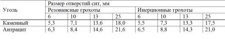 На современных инерционных грохотах со щелевидными ситами с размером щели 0,5 мм приняты следующие нагрузки, т/м2: