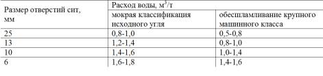 Для мокрой классификации используется оборотная вода с содержанием шлама до 80 г/л. Для обесшламливания рекомендуется примерно одну треть воды подавать в приемный желоб грохота, остальную – через одно-два брызгальных устройства, расположенных над грохотами. Нормы расхода воды на мокрую классификацию приведены в табл. 1.17.