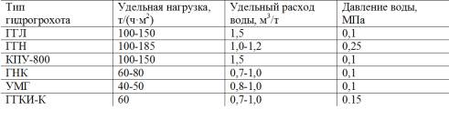 Удельные нагрузки и удельные расходы воды на гидрогрохоты