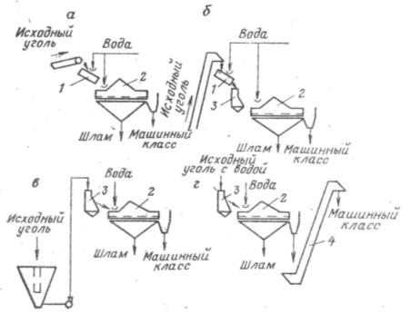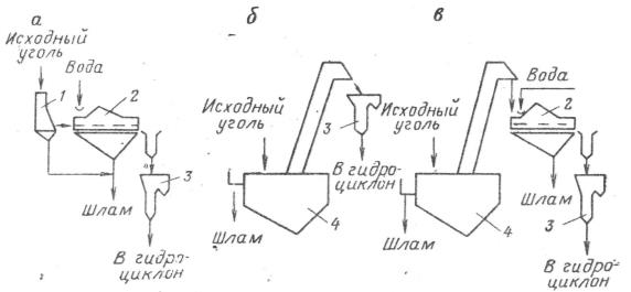 Рис. 1.21. Схемы подачи угля на дешламацию перед обогащением в гидроциклонах: