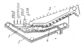 Сепаратор Тромпа для разделения угля на два продукта (рис. 2.6) представляет собой ванну, состоящую из двух частей: для суспензии 1 и для поддержания нижней ветки пластинчатого конвейера 2, снабженную верхним скребковым конвейером 3 и нижним скребковым конвейером 4. Уголь подается в сепаратор и расслаивается на две части: концентрат, удаляемый нижней ветвью конвейера 3, и отходы, удаляемые верхней частью конвейера 4.