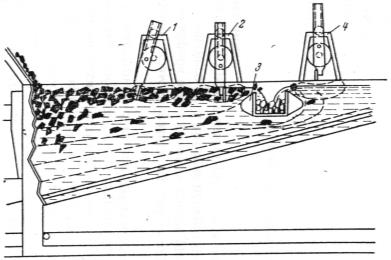 Механические лопаты для продвижения всплывшего продукта к выпускному желобу показаны на рис. 2.10. Лопаты 1 и 2 продвигают всплывший продукт к выпускному желобу 3, а лопата 4 возвращает всплывшие зерна, случайно попавшие в желоб.