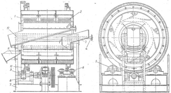Барабанный тяжелосредный сепаратор с элеваторной разгрузкой представляет собой вращающийся барабан 1, на внутренней поверхности которого закреплены перфорированные лопасти 2 (рис. 2.14).