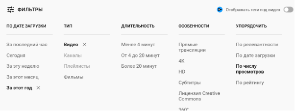 Заходим, например на ютуб вписываем тему нашего канала. Делаем фильтр по просмотрам и за год.
