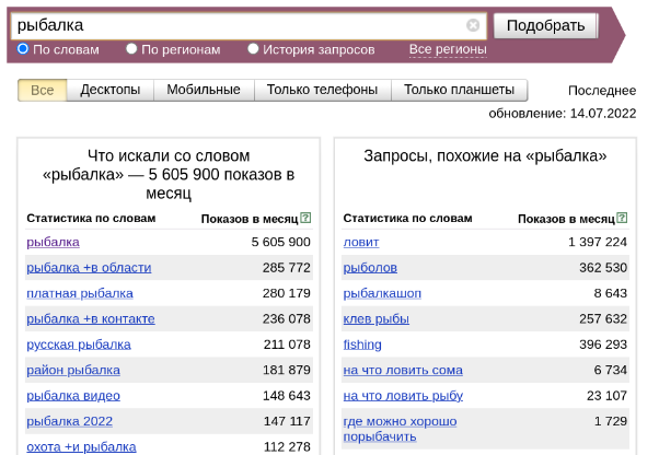 Допустим у нас тема рыбалки. Заходим в сервис (для этого в поиске введите “подбор ключевых слов от яндекса” и переходите по первой ссылке в поиске) и в поиске сервиса пишем тему нашего канала: