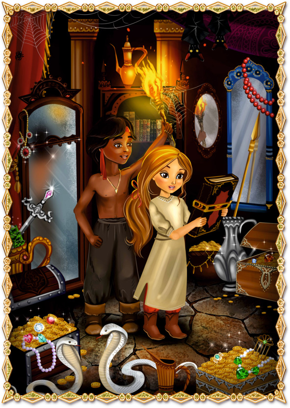 Яркий огонь осветил подземную комнату, и Инди увидела своё отражение в старинных серебряных зеркалах, украшенных сверкающими камнями. Повсюду стояли сундуки с золотыми монетами и драгоценностями, которые охраняли белые королевские кобры.